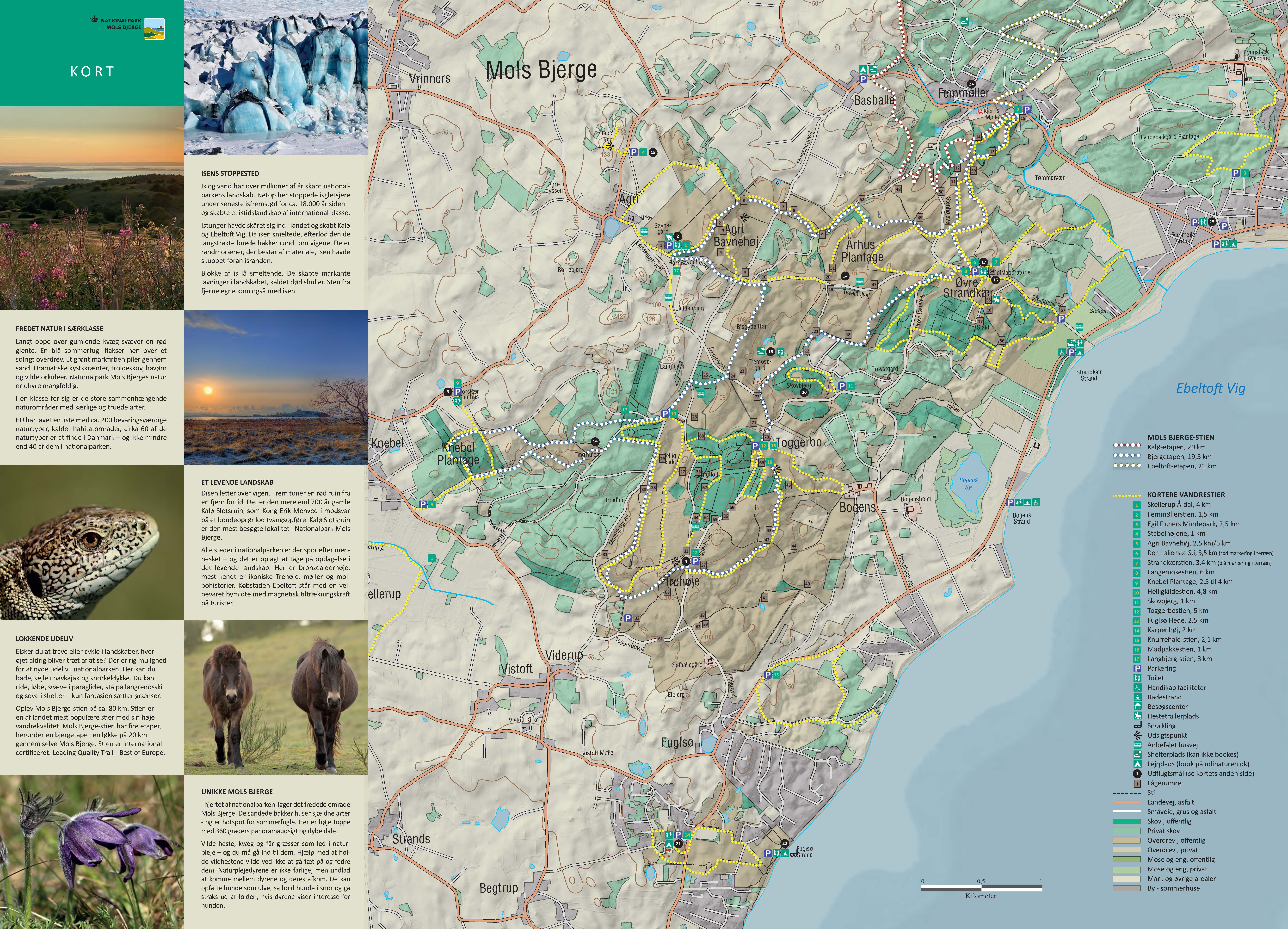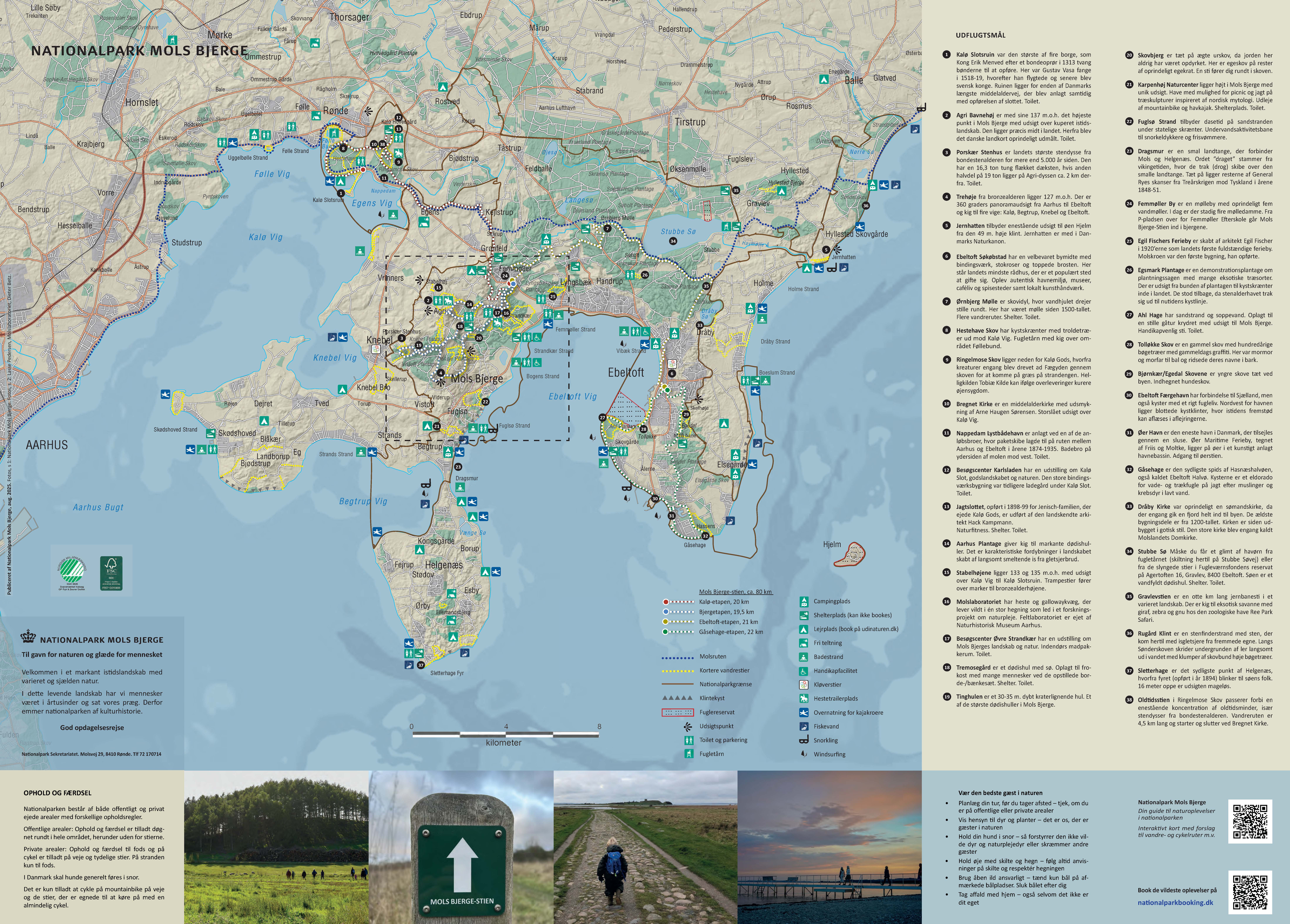 På bagsiden er der et kort over Mols Bjerge, der er hjertet i Nationalparken. Her finder du også oplysninger om nationalparkens landskab, natur, kulturhistorien, friluftsmuligheder og selve Mols Bjerge.